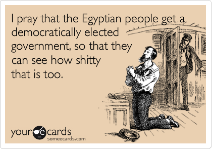 To update all of you would-be world news followers who were too busy this weekend - Mubarak stepped down as president of Egypt. Apparently he was leaving to vacation at his seaside palace at the Red Sea resort of Sharm el-Sheikh and didn't want to be president anymore anyway. Not sure how it's still his palace if he stepped down, or if he made it there.